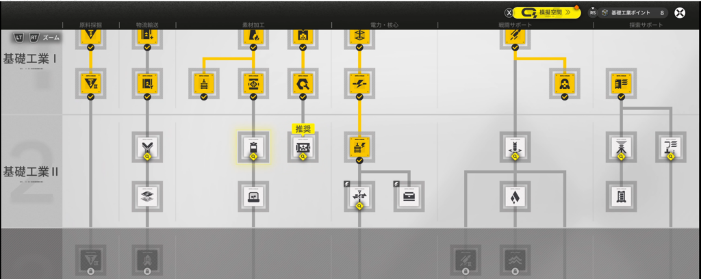 基礎工業Ⅱはこのゲームの売りでもあるジップラインや発電機など重要なものが解禁される重要な節目です
